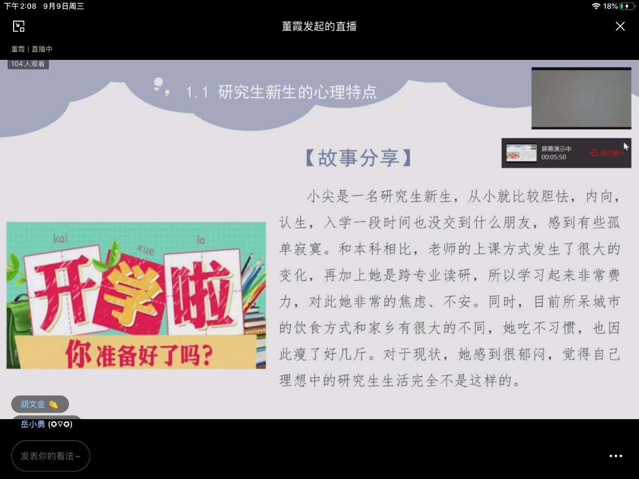 董老师首先为大家讲解大部分新生在入学后学习、人际、生活以及对未来就业方面所出现的各类心理状况,并对其中可能会出现的问题进行了提示与解答。董霞老师还列举了一些生动的故事和典型的例子,让化工国产主播的研究生新生对心理问题有了更为深刻的认知,也为大家将来在面对此类问题的情况时提供了更好的解决的办法以及寻求帮助的途径。