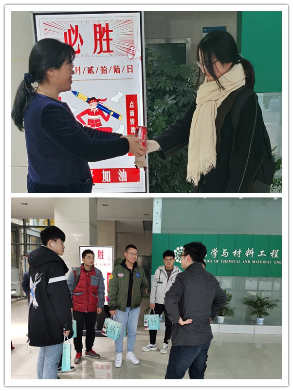 考研慰问品装在专门为化工考研学子定制的加油包中,加油包中有印有祝福语的可乐、暖手宝、士力架,还有由班主任、辅导员、班级同学手写的,印有报考院校照片的明信片。希望考研学子“喝了冰可乐,精神爽爽的;捧着暖宝宝,心里暖暖的;吃了士力架,能量满满的;看了明信片,信心足足的;坚持拼到底,升学稳稳的”。在场老师关切地询问考研同学近期的复习情况,关心他们有没有遇到困难,嘱咐他们注意劳逸结合、饮食规律、防寒保暖,鼓励他们努力到最后一场考试结束,祝愿他们成功考取理想中的院校。